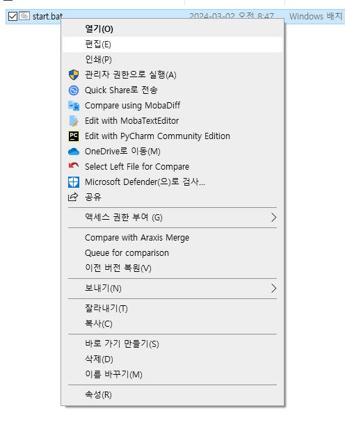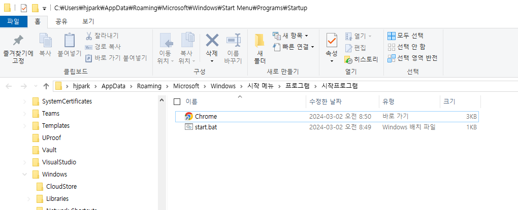 만일 자동 시작하길 원하는 앱이 시작 메뉴에 없다면 배치파일을 하나 만들어서 경로를 적어줍니다