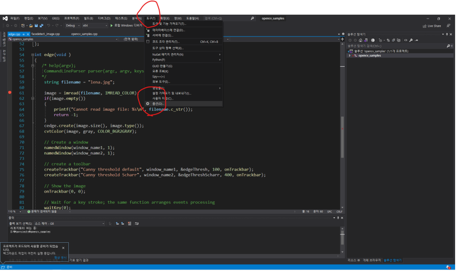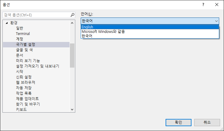 2. Visual Studio 2019 -> 도구->옵션->환경->국가별 설정->English
