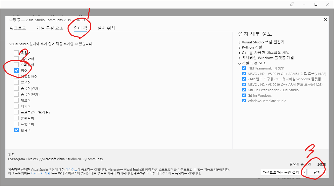 1. Visual Studio Installer 언어팩에서 영어 인스톨