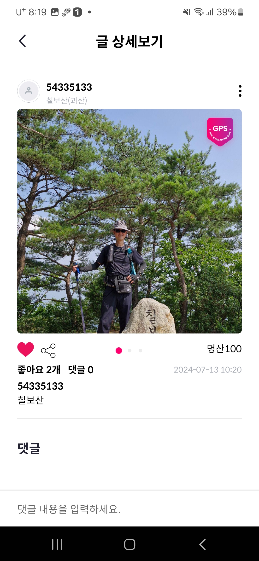 2024년 07월 13일(토)그동안 등산을 좀 다니긴 했지만 백대명산 인증을 안한지라, 이제 부터라도 인증을 시작하기로 했다.무언가 목표가 있음면 열심히 하기 때문에 등산을 열심히 하기위해서 백대명산 정복을 목표로 삼았다.그 첫번째로 충북 괴산에 있는 칠보산을 다녀 왔다..아래는 앱에서 인증 받은 사진입니다. 칠보산은 충북 괴산군에 위치하고 속리산 국립공원에 속하며 괴산 35명산 중 하나입니다.칠보산은 일곱 개의 봉우리가 불교의 일곱 가지 보물인 금, 은, 산호, 거저(바다조개), 마노(석영), 파리(수정), 진주처럼 아름답다고 하여 붙여진 이름입니다.칠보산 정상 778m에 서면 장성봉, 대야산, 옥녀봉, 군자산, 보배산 등 속리산국립공원에 속해 있는 주변 산들과 백두대간 산줄기가 장쾌하게 뻗어있는 멋진..