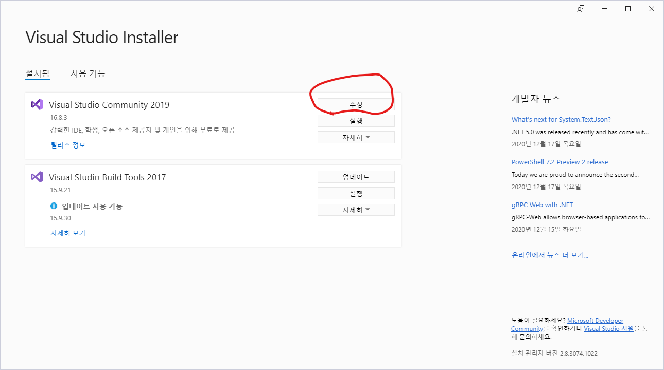 Visual Studio 2019 언어를 영어로 바꾸는 방법 1. Visual Studio Installer 언어팩에서 영어 인스톨 2. Visual Studio 2019 -> 도구->옵션->환경->국가별 설정->English 3. Visual Studio 재 시작 Visual Studio 2020.12.27